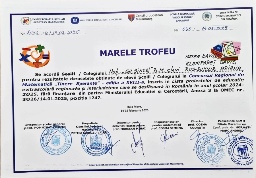 Marele trofeu a intrat în poesia Colegiului Național „Gheorghe Șincai” Baia Mare, elevii David Hotea, David Zlampareț și Ariana Rus-Bucur din clasa a VIII-a obținând punctaj maxim la proba pe echipe. Rezultate excelente au obținut, de asemenea, și la individual. Doi dintre elevi au obținut maxim de puncte, iar unul cu doar un punct mai puțin.