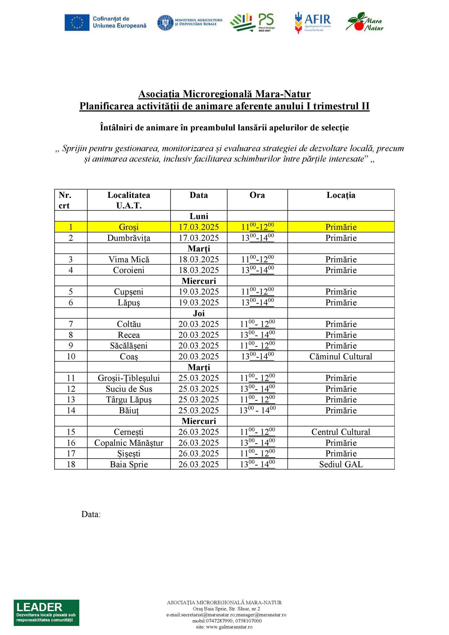 Vă aducem la cunoștință că luni, 17.03.2025, începând cu ora 11:00, vă așteptăm la sediul primăriei, la o întâlnire publică organizată de către GAL Mara Natur. Principalele subiecte vor fi: Prezentarea Strategiei de Dezvoltare Locală pentru perioada 2025-2028 și totodată informarea privind finanțările care vor putea fi accesate prin GAL.