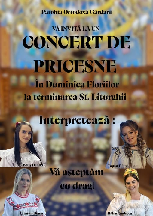 În Duminica Floriilor, 13 aprilie, după Sfânta Liturghie, un frumos concert de pricesne va avea loc la biserica din Gârdani.