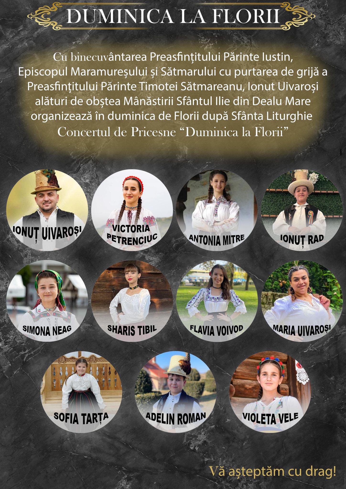 Cu binecuvântarea Preasfințitului Părinte Iustin, Episcopul Maramureșului și Sătmarului, cu purtarea de grijă a Preasfințitului Părinte Timotei Sătmarenul, Arhiereu-vicar, Ionuț Uivaroși alături de obștea Mănăstirii „Sfântul Ilie” din Dealu Mare (comuna Coroieni) organizează Concertul de Pricesne “Duminica la Florii”.