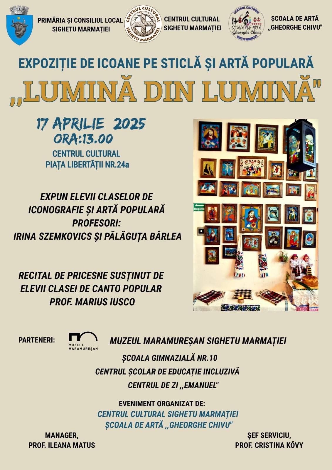 În 17 aprilie, de la ora 13.00, la Centrul Cultural Sighetu Marmației va avea loc expoziție de icoane pe sticlă și artă populară „Lumină din lumină”.