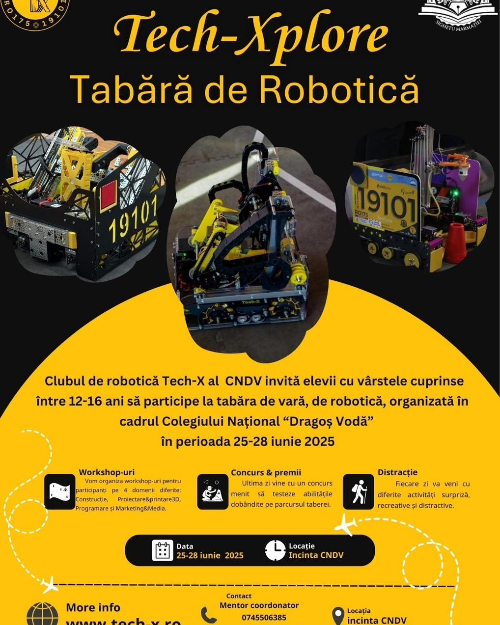 Clubul de robotică Tech-X al Colegiului Național „Dragoș Vodă” te invită, dacă ai între 12 și 16 ani, să participi la tabăra de robotică organizată în perioada 25–28 iunie 2025, chiar în incinta colegiului!