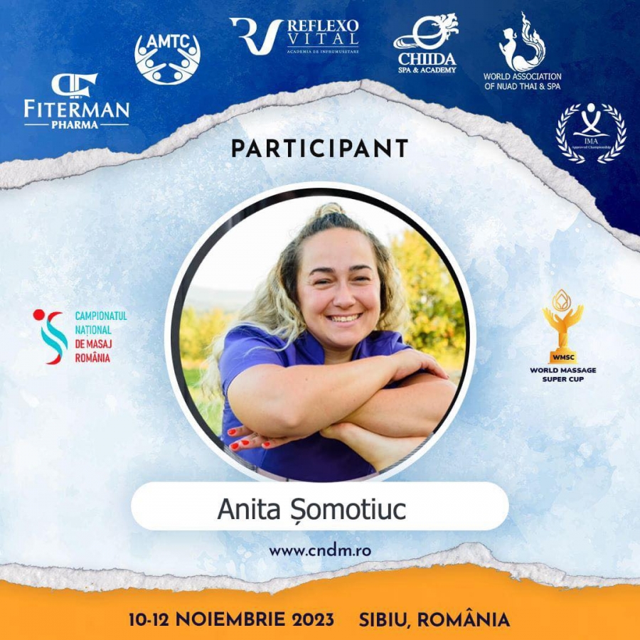 Municipiul Baia Mare, în ediția competițiilor de anul acesta, va fi reprezentat în categoria masaj wellness de către Anita Șomotiuc, tehnician maseur cu o arie de competență extinsă atât în ceea ce privesc diversele tipuri de masaj: de relaxare, terapeutic, sportiv, anticelulitic, reflexoterapie , cât și în expertiza în tehnici precum scrub, gua-sha, terapie cu ventuze, masaj bucal, terapie cu miere, maderoterapie, bețe de bambus, pietre vulcanice, IASTM, sare de Himalaya, herbal ball ș.a.m.d.
