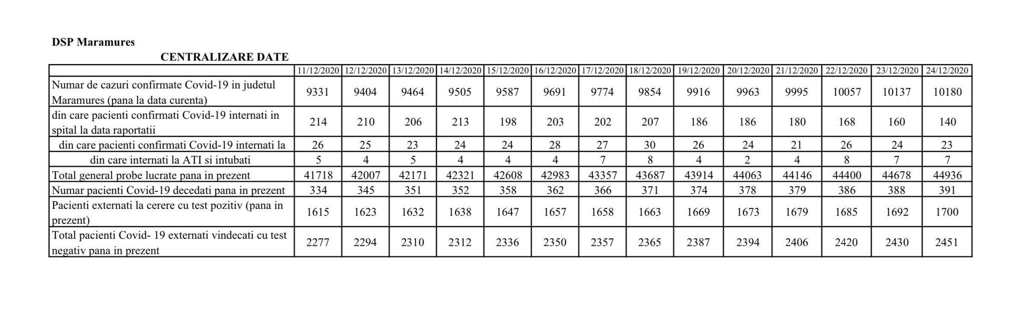 Coronavirus, 24 decembrie 2020: S-a ajuns la 391 decese în Maramureș (încă 3)! În județ, în total, 10.180 cazuri de la început (43 noi)