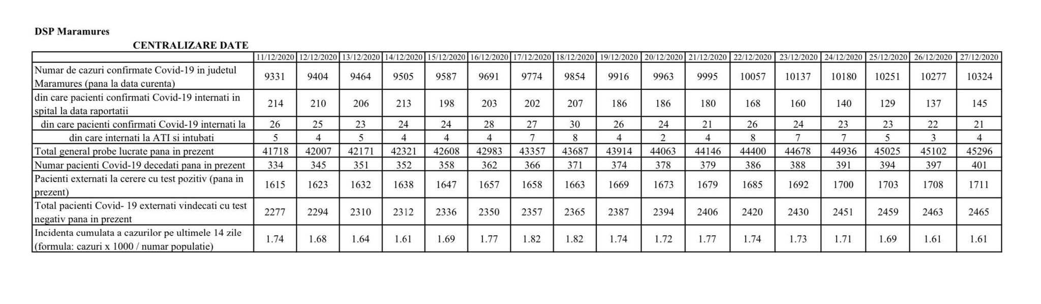 Coronavirus, 27 decembrie 2020: S-a ajuns la 401 decese în Maramureș (încă 4)! În județ, în total, 10.324 cazuri de la început (47 noi)