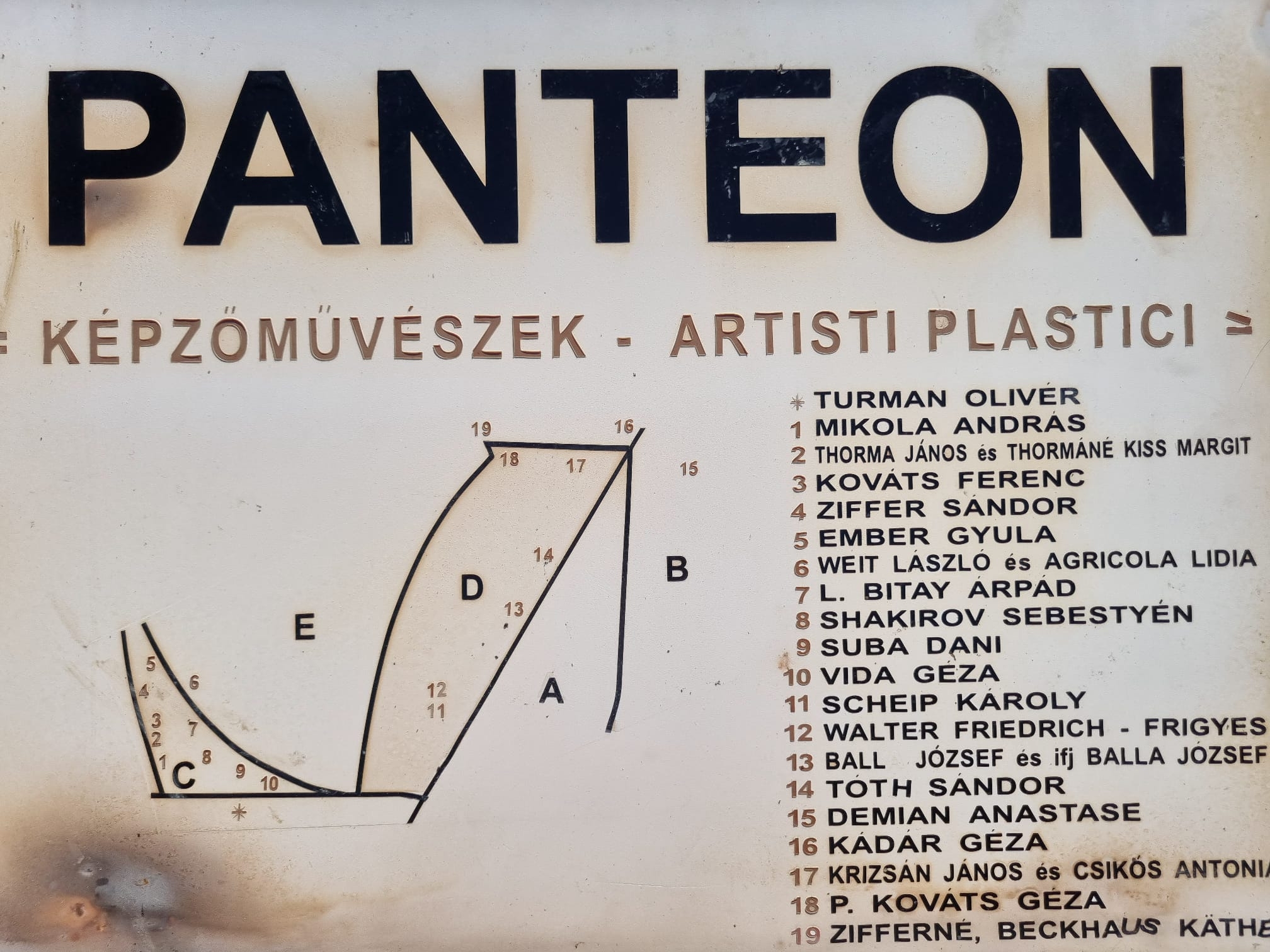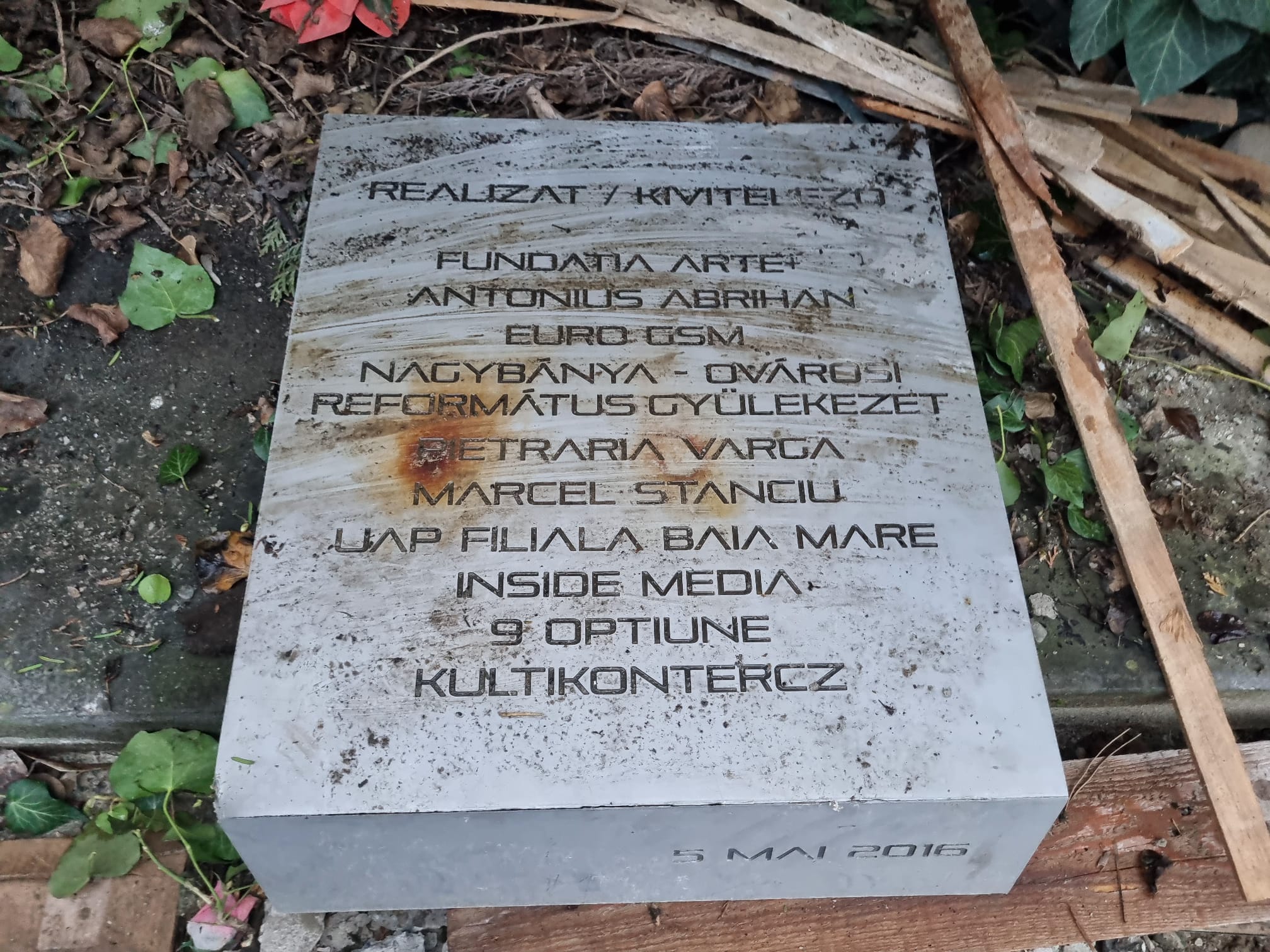 Pe soclul monumentului stă scris numele fiecăruia dintre cei care au contribuit la realizarea monumentului Pantheonul de la Dealul Florilor: Fundația Arte+, Antonius Abrihan, Euro GSM, Nagybánya-Óvárosi Református Gyülekezet, Pietrăria Varga, Marcel Stanciu, UAP Filiala Baia Mare, Inside Media, 9 Opțiune, Kultikontercz (radiată între timp prin faliment, antecesoare a Kultikon Plus SRL).