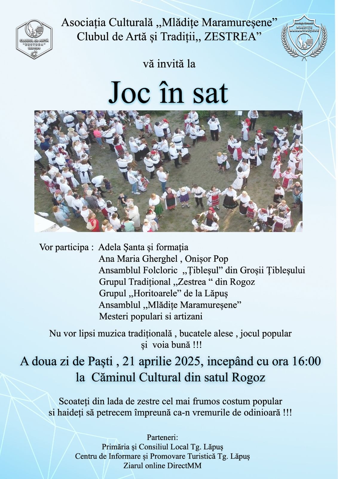 În a doua zi de Paști, 21 aprilie, începând cu ora 16:00, la Căminul Cultural din Rogoz se organizează „Joc în sat”.