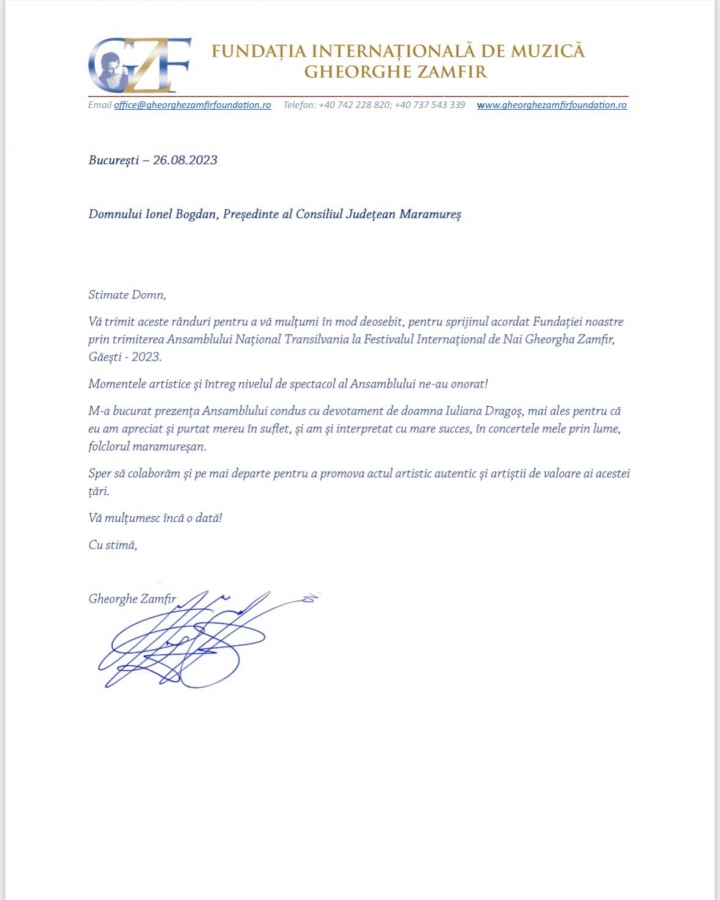 „Vă transmit aceste rânduri pentru a vă mulțumi în mod deosebit, pentru sprijinul acordat Fundației noastre prin trimiterea Ansamblului Naional Transilvania la Festivalul Internațional de Nai Gheorghe Zamfir, Găiești 2023.