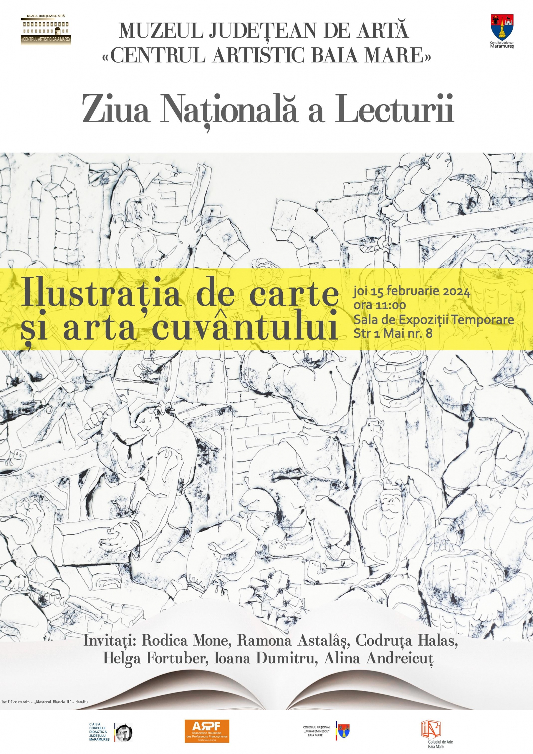 Muzeul Județean de Artă «Centrul Artistic Baia Mare» în parteneriat cu Colegiul Național „Mihai Eminescu” Baia Mare, Colegiul de Arte Baia Mare, filiala Maramureș a Asociației Române a Profesorilor Francofoni și Casa Corpului Didactic Maramureș vă invită să vă alăturați evenimentului special intitulat „Ilustrația de carte și arta cuvântului”. În cadrul acestuia, veți avea ocazia să descoperiți o selecție din ilustrațiile de carte aflate în patrimoniul muzeului și să explorați modul în care arta cuvântului se îmbină armonios cu ilustrația pentru a crea povești captivante și pline de înțelesuri profunde.
