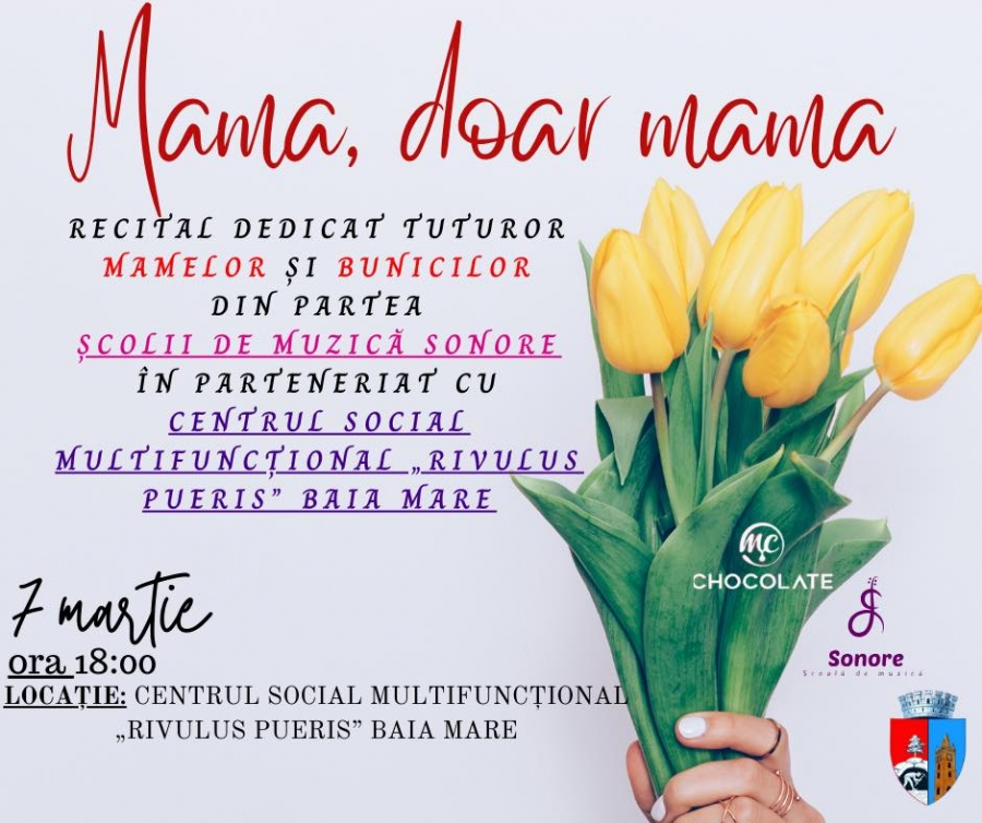 ”Cum am putea să celebrăm ziua mamelor, altfel decât prin ceea ce știm să facem mai bine și mai frumos? Elevii noștri au pregătit ceva frumos, pentru cele care le-au dat viață! Vă invităm, dragi mămici și bunici, să ne fiți alături în data de 7 Martie, orele 18:00 la Centrul Social Multifuncțional Rivulus Pueris Baia Mare”, arată organizatorii.