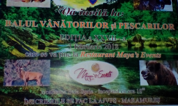 Cea de-a XXVII-a ediție a Balului Vânătorilor și Pescarilor Sportivi va avea loc în data de 3 februarie. Evenimentul este organizat de Asociația Județeană a Vânătorilor și Pescarilor Sportivi (AJVPS) din Maramureș și va avea loc la restaurantul Maya’s Events din Baia Sprie, cu începere de la ora 18.00.