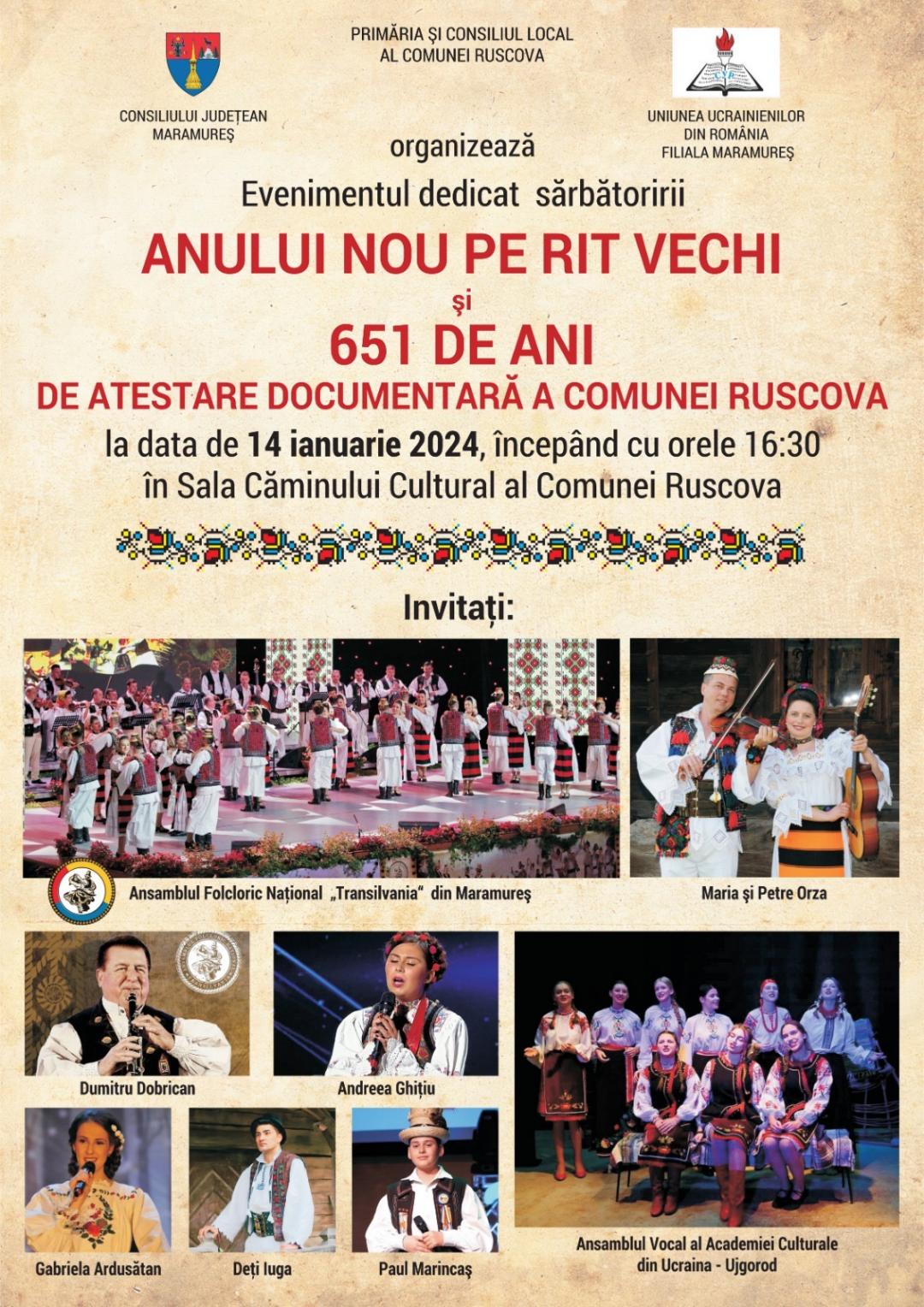Duminică, 14 ianurie, începând cu ora 16:30, la Căminul Cultural din Ruscova se va sărbători Anul Nou pe rit vechi și 651 de ani de la atestarea comunei.