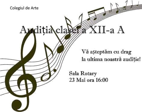 Miercuri, 23 mai, începând cu ora 16, la Colegiul de Arte din Baia Mare, în sala Rotary, va avea loc ultima audiție a clasei a XII-a A, cu ocazia absolvirii. La eveniment sunt așteptați deopotrivă profesorii și elevii colegiului.