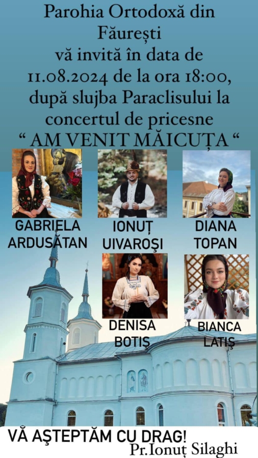 Duminică, 11 august, Parohia Ortodoxă Făurești va găzdui concertul de pricesne „Am venit, Măicuță”.