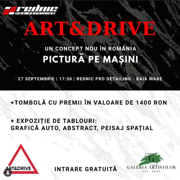 Expoziția de mașini ART&DRIVE, care va avea loc sâmbătă, 27 septembrie de la ora 17:30 la Rednic Pro Detailing Baia Mare, este un concept care îmbină arta vizuală cu domeniul auto și tuningul.