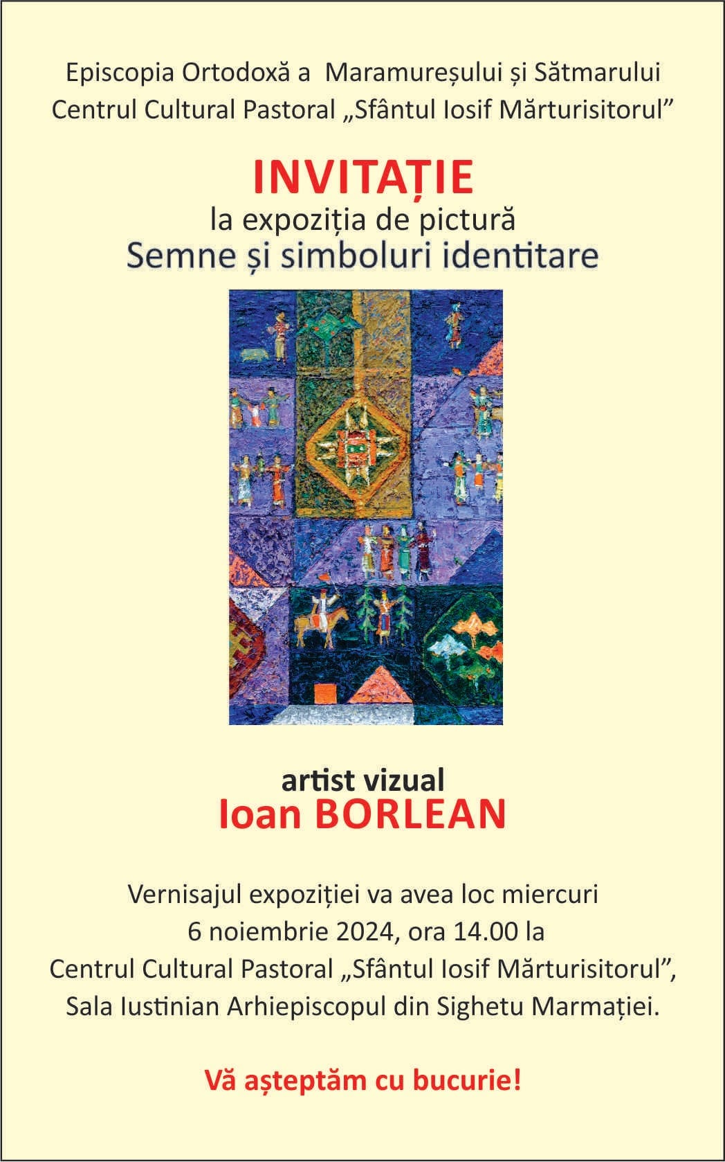 Miercuri, 6 noiembrie, de la ora 14:00, va avea loc vernisajul expoziției de pictură „Semne și simboluri identitare”, semnată de artistul vizual Ioan Borlean. Evenimentul se va desfășura în sala Justinian Arhiepiscopul a Centrului Cultural Pastoral „Sfântul Iosif Mărturisitorul” din Sighetu Marmației.