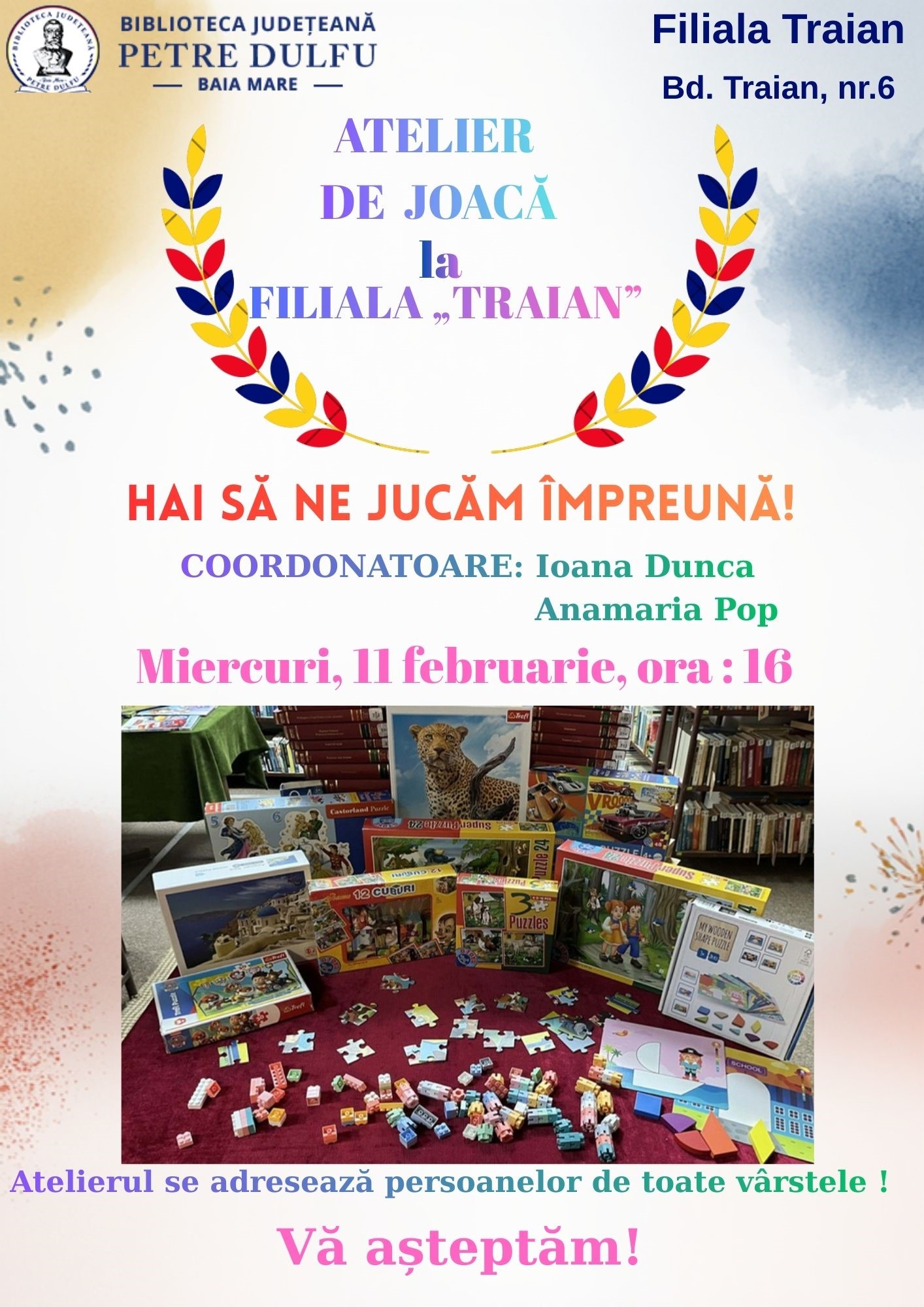 Filiala Traian a Bibliotecii Județene „Petre Dulfu” Baia Mare organizează mâine, 11 februarie, începând cu ora 16:00, un Atelier de joacă dedicat persoanelor de toate vârstele. Evenimentul va avea loc la sediul filialei situate pe bulevardul Traian, nr. 6.