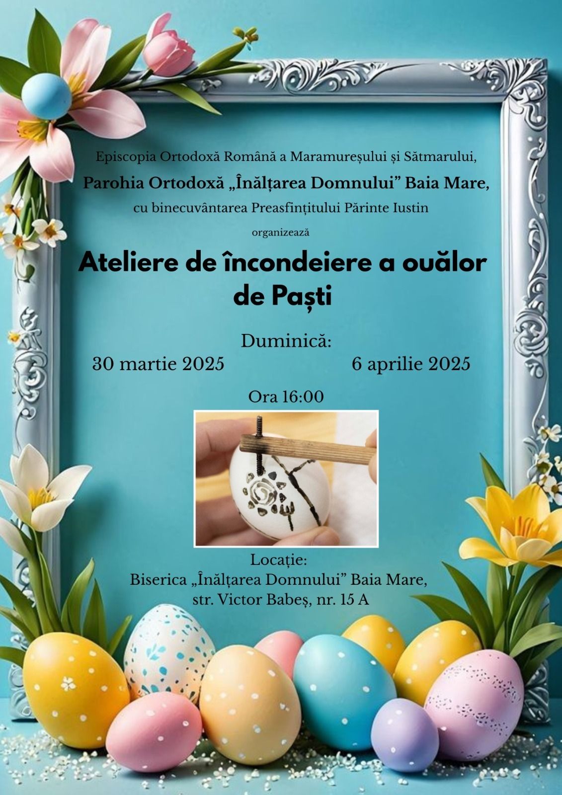 „Cu binecuvântarea arhierească a Presfințitului Părintelui nostru Iustin, Episcopul Maramureșului și Sătmarului, organizăm pentru copiii și tinerii (împreună cu părinții lor) parohiei noastre două ateliere cu tematică prepascală.