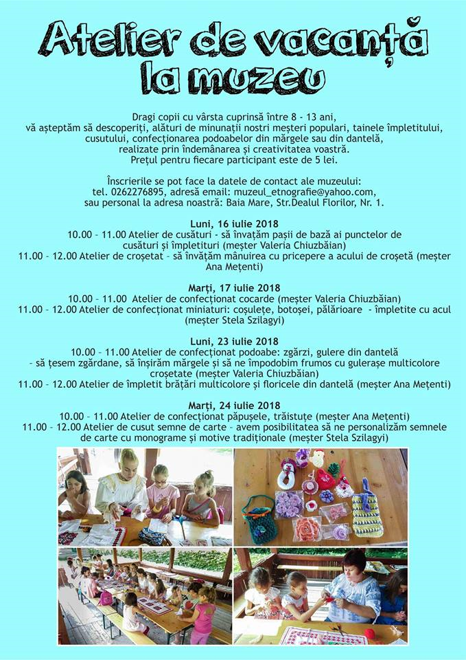 O serie de ateliere de lucru, pentru copiii cu vârste cuprinse între 8 și 13 ani, se vor derula în Muzeul Satului din Baia Mare în perioada 16-17,respectiv 23-24 iulie. Copiii sunt așteptați de meșteri populari cunoscuți, pentru a fi inițiați în arta cusutului și a împletitului. Iată și programul pe zile: