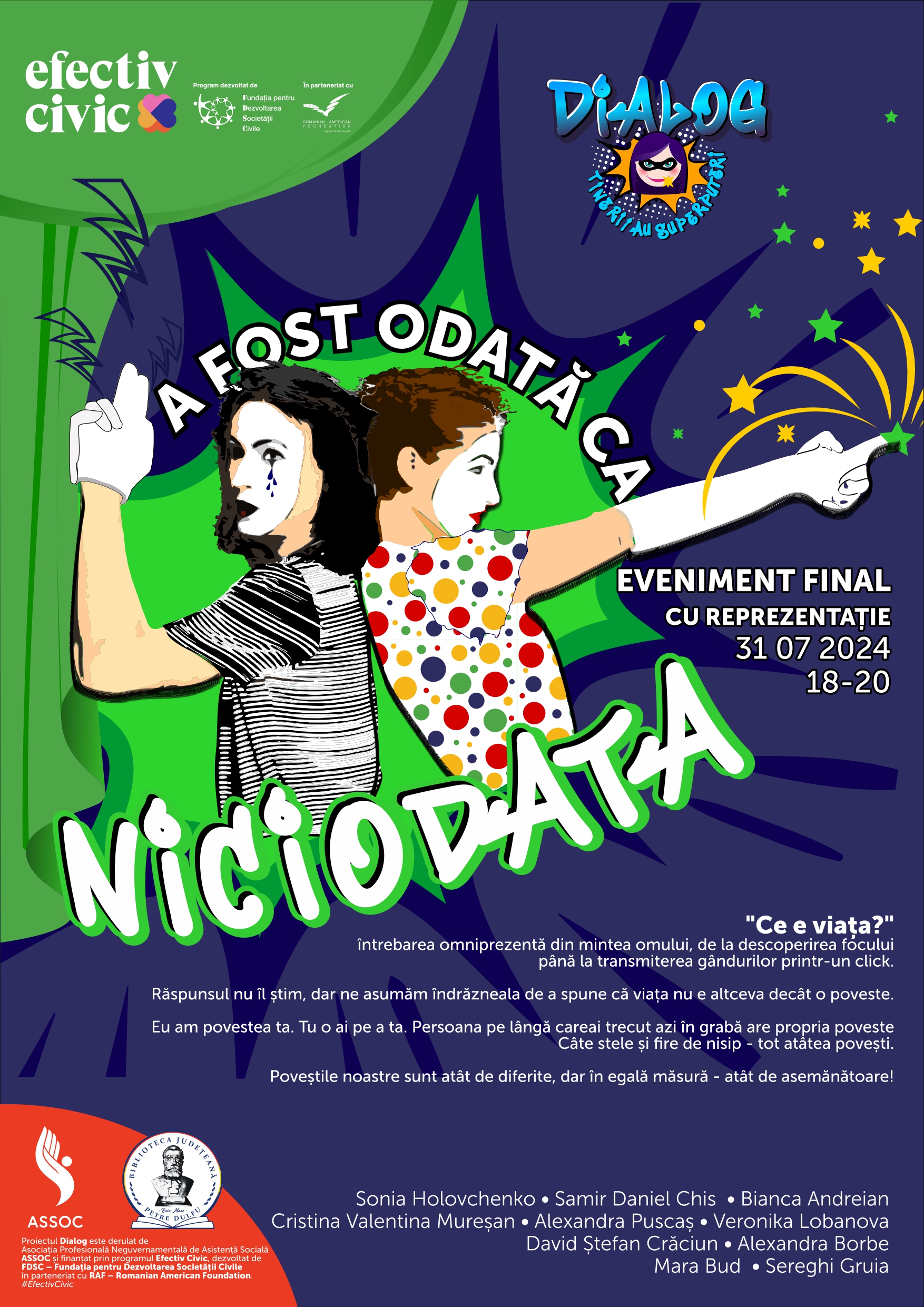 Va avea loc prima reprezentație a spectacolului „A fost odată ca niciodată”, realizat în cadrul proiectului Dialog implementat de Asociația Profesională Neguvernamentală de Asistență Socială ASSOC în cadrul programului Efectiv civic, dezvoltat de Fundația pentru Dezvoltarea Societății Civile în parteneriat cu Romanian American Foundation.
