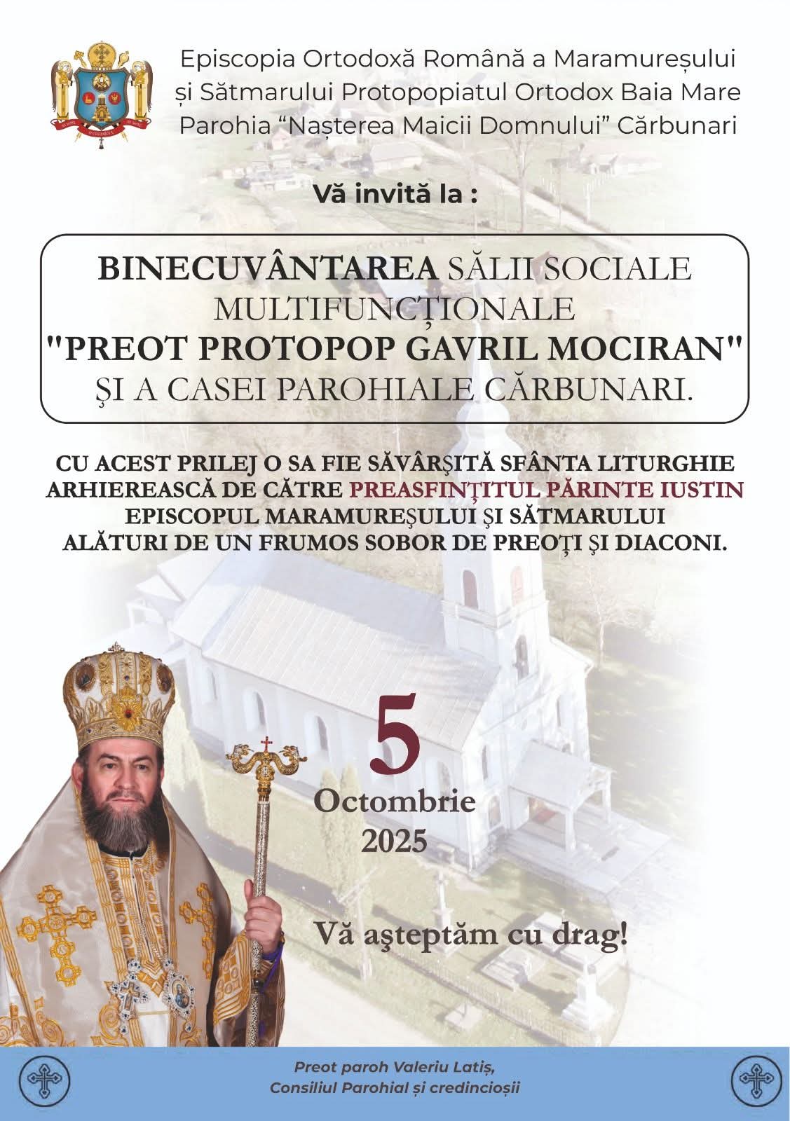 Parohia Ortodoxă „Nașterea Maicii Domnului” Cărbunari (preot paroh Valeriu Latiș) invită credincioșii în această duminică, 5 octombrie, la binecuvântarea sălii sociale multifuncționale „Preot Protopop Gavril Mociran” și a casei parohiale din localitate.