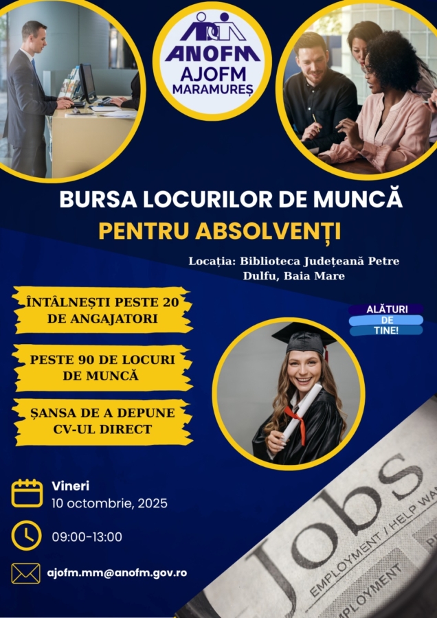 Agenția Județeană pentru Ocuparea Forței de Muncă Maramureș, în colaborare cu Biblioteca Județeană „Petre Dulfu” Baia Mare organizează „Bursa locurilor de muncă pentru absolvenți 2025”, care se va desfășura vineri, 10 octombrie, în intervalul orar 09:00-13:00. Cu această ocazie, în Sala de Conferințe a bibliotecii va avea loc, de la ora 10:00, lansarea proiectului „Acces la ocupare”, dedicat tinerilor NEETs.