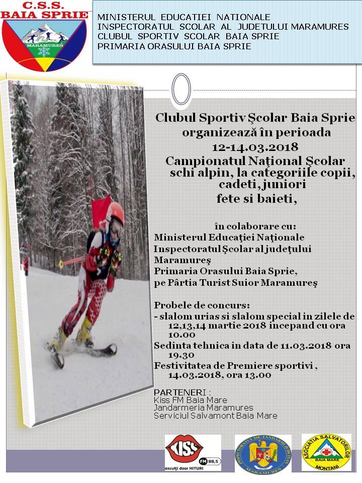În perioada 12-14 martie, CSȘ Baia Sprie organizează, pe Pârtia Turist Șuior, Campionatul Național Școlar de schi alpin, la categoriile copii, cadeți, juniori (fete și băieți). Probele de slalom uriaș și slalom special încep la orele 10.00 în fiecare din cele trei zile de concurs. Festivitatea de premiere va avea loc în 14 martie de la orele 13.00.