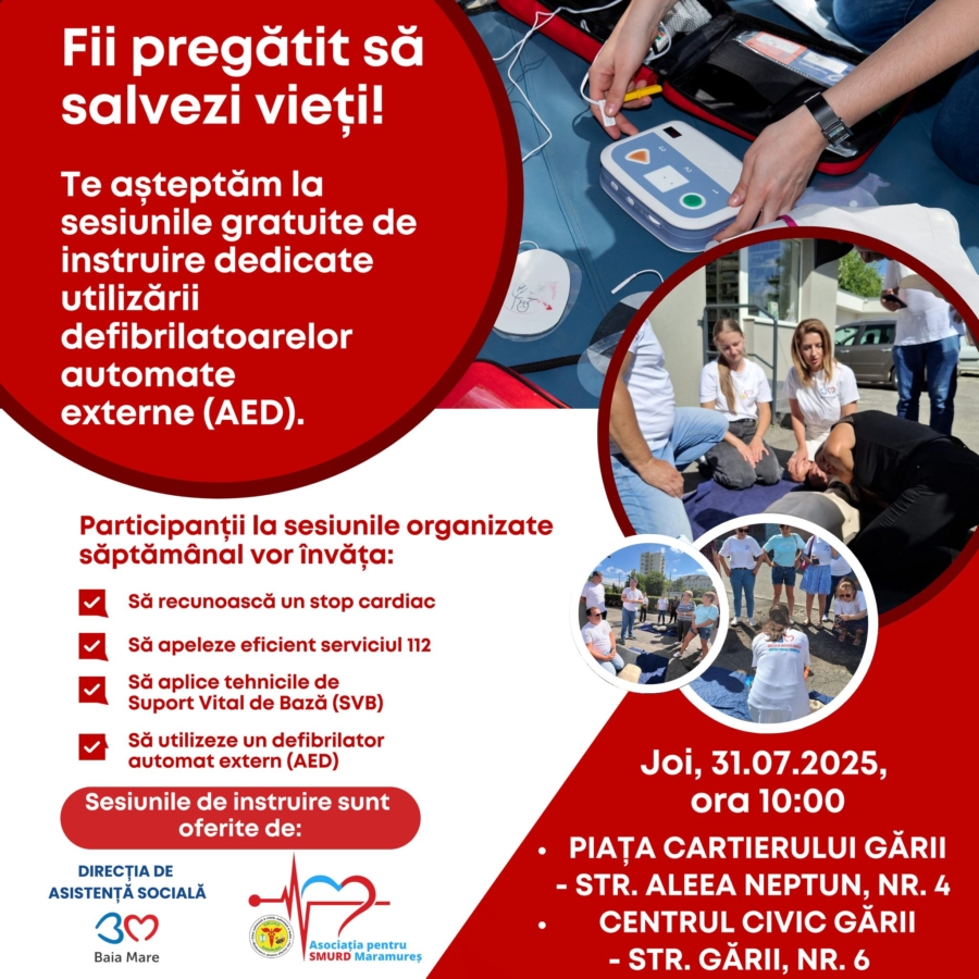 Direcția de Asistență Socială Baia Mare în parteneriat cu Asociatia pentru SMURD Maramureș organizează, în fiecare săptămână, sesiuni gratuite de instruire dedicate utilizării defibrilatoarelor automate externe (AED), în punctele cheie din oraș.
