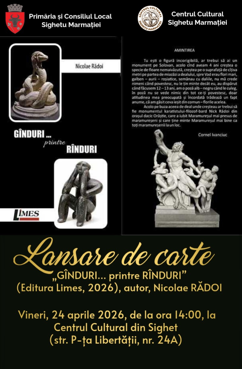 Cartea „GÎNDURI… printre RÎNDURI”, semnată de Nicolae Rădoi, va fi lansată la Centrul Cultural din Sighetu Marmației