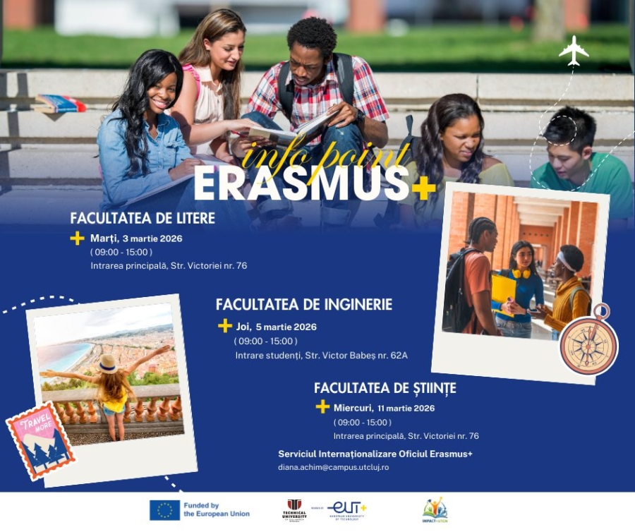 În acest context, Universitatea Tehnică din Cluj-Napoca- Centrul Universitar Nord Baia Mare invită toți studenții la o serie de întâlniri dedicate programului Erasmus+, în cadrul cărora vor fi prezentate mobilitățile, experiențele internaționale și pașii concreți pentru a studia în străinătate, precum și inițiativa „IMPACT UTCN”. Întâlnirile vor avea loc în intervalul orar 09:00-15:00 astfel: