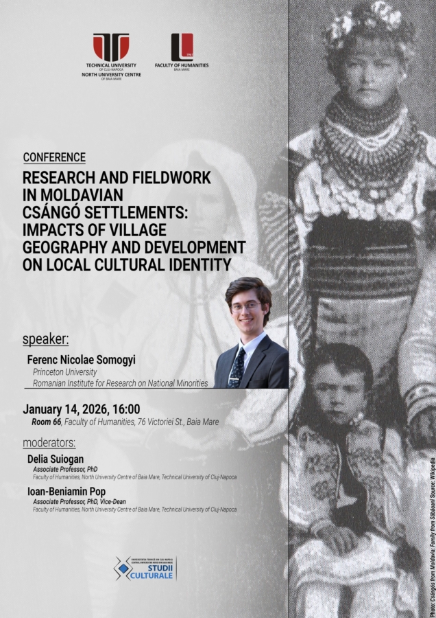 Facultatea de Litere din cadrul Universității Tehnice din Cluj-Napoca- Centrul Universitar Nord Baia Mare organizează miercuri, 14 ianuarie 2026, conferința intitulată „Cercetare și teren în așezările ceangăilor din Moldova: Influența geografiei și dezvoltării sătești asupra identității culturale locale”. Evenimentul va avea loc de la ora 16:00, în Sala 66 a Facultății de Litere (str. Victoriei nr. 76) și se adresează studenților înscriși în domeniul Studii Culturale.
