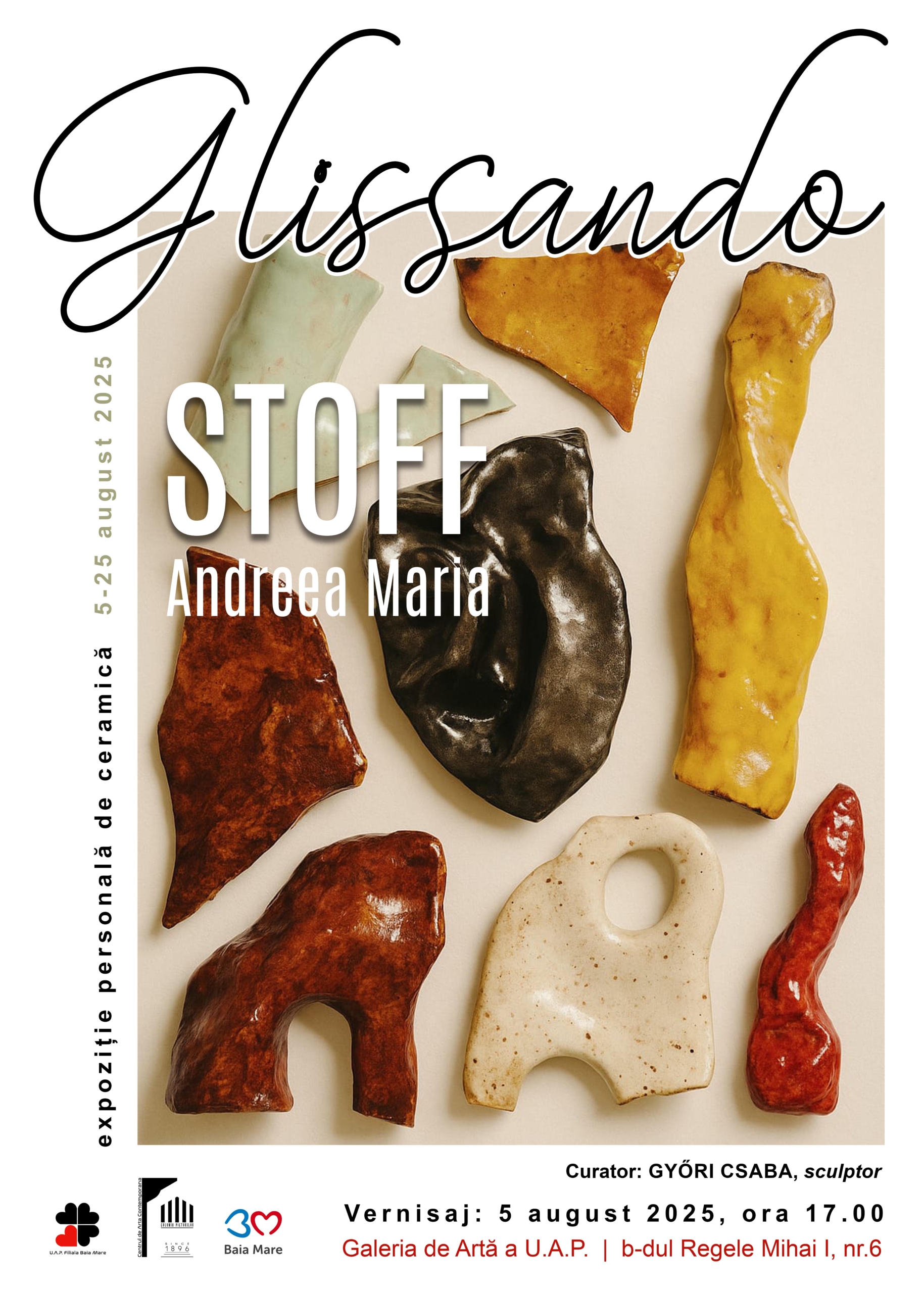 Iubitorii artelor sunt invitați la vernisajul expoziției „Glissando” a ceramistei Andreea Maria STOFF. Evenimentul va avea loc marți, 5 august, ora 17:00, la Galeria de Artă a U.A.P Baia Mare.