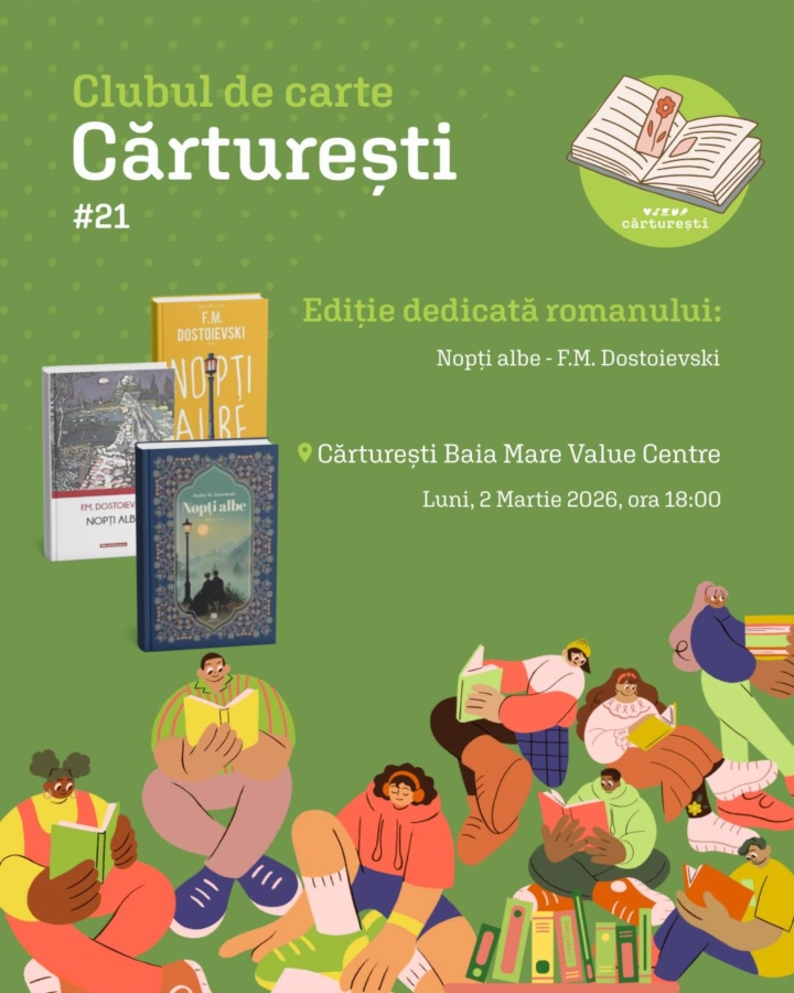 Librăria Cărturești din incinta Value Centre Baia Mare organizează luni, 2 martie 2026 de la ora 18:00, o nouă întâlnire a clubului de carte, dedicată romanului „Nopți albe” de F.M. Dostoievski.