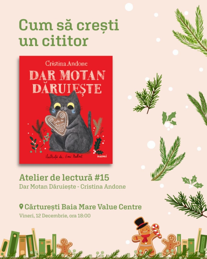 La librăria Cărturești din incinta Value Centre Baia Mare, atelierul de lectură destinat copiilor „Cum să crești un cititor” revine cu cea de-a 15-a ediție, în data de 12 decembrie de la ora 18:00.