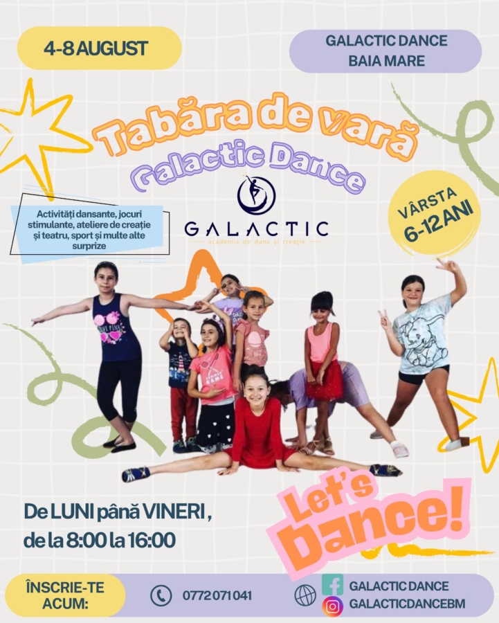 Tabăra de vară „Galactic Dance 2025” se organizează în perioada 4-8 august și se adresează copiilor cu vârsta de 6-12 ani. Activitatea va avea loc la sala de dans amplasată pe Str. Petre Dulfu 1C, Baia Mare.
