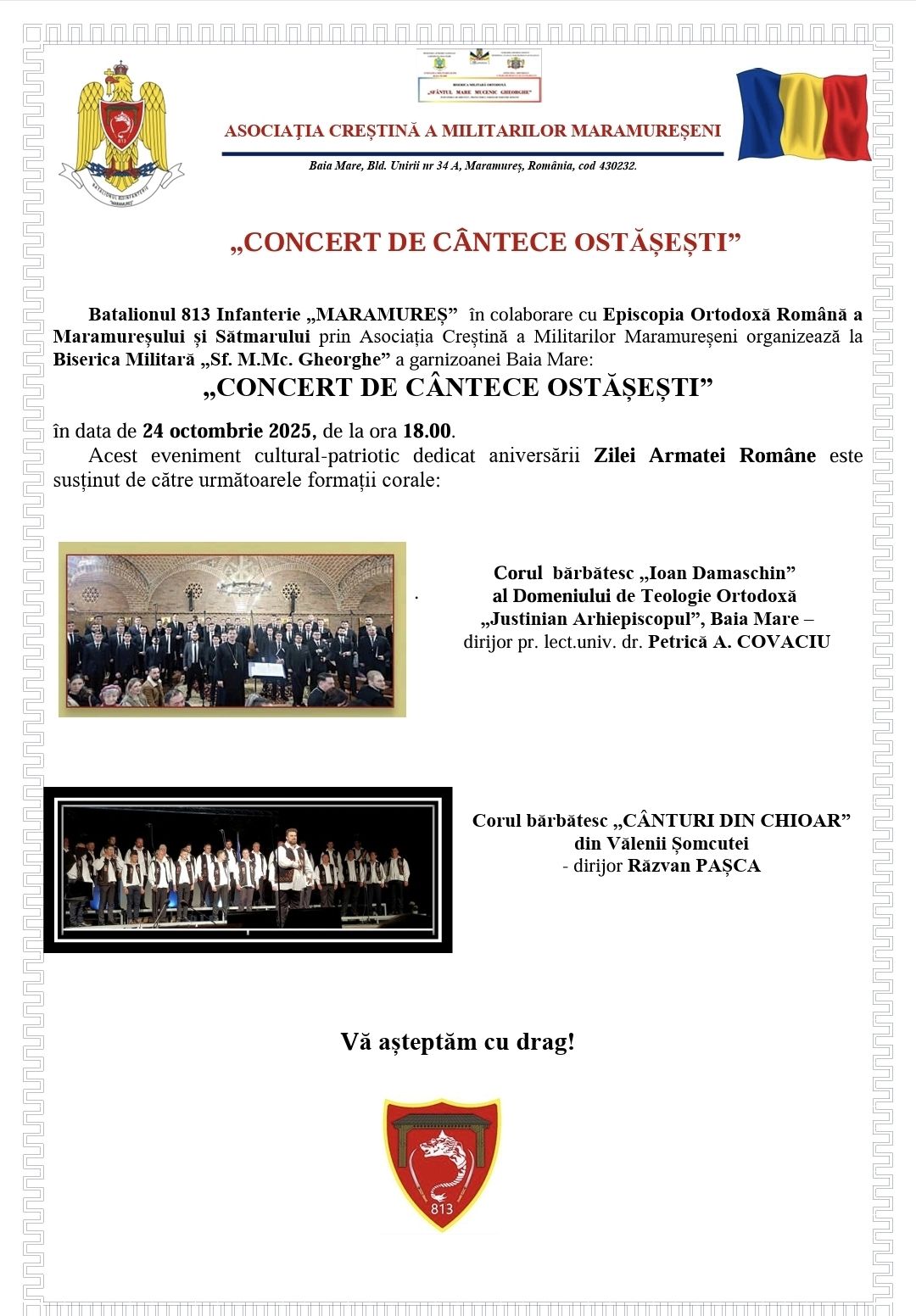 Batalionul 813 Infanterie „Maramureș”, în colaborare cu Episcopia Ortodoxă Română a Maramureșului și Sătmarului și Asociația Creștină a Militarilor Maramureșeni, organizează un eveniment cultural-patriotic de excepție – „Concert de cântece ostășești”.
