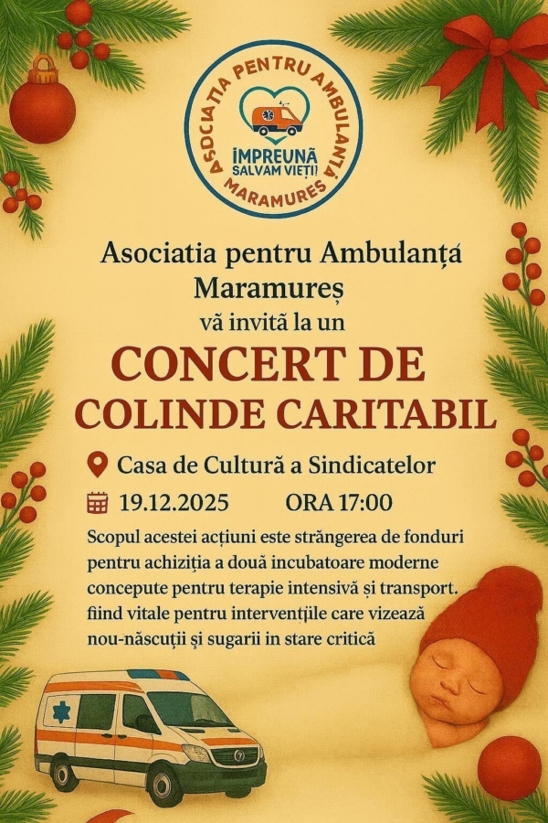 Vineri, 19 decembrie 2025, Casa de Cultură a Sindicatelor Baia Mare va fi gazda unui concert emoționant de colinde cu scop caritabil, care va avea loc de la ora 17:00.
