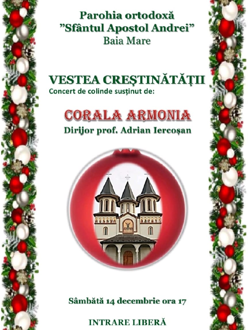 Sâmbătă, 14 decembrie, de la ora 17.00, Parohia Ortodoxă „Sfântul Apostol Andrei” din Baia Mare va găzdui concertul de colinde „Vestea creștinătății”.