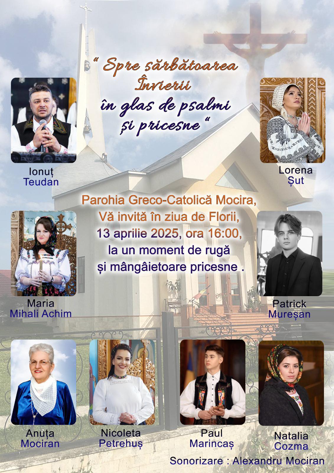 În Duminica Floriilor, 13 aprilie, de la ora 16.00, Parohia Greco-Catolică Mocira (comuna Recea) va gădui evenimentul „Spre sărbătoarea Învierii în glas de psalmi și pricesne”.