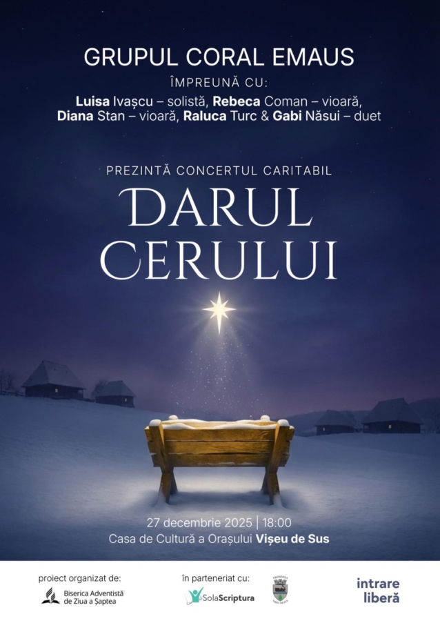 Ritmul muzicii se va îmbina cu armonia sărbătorilor de iarnă în data de 27 decembrie, în cadrul concertului cu scop caritabil „Darul Cerului”, care va avea loc la Casa de Cultură din Vișeu de Sus, la ora 18:00.