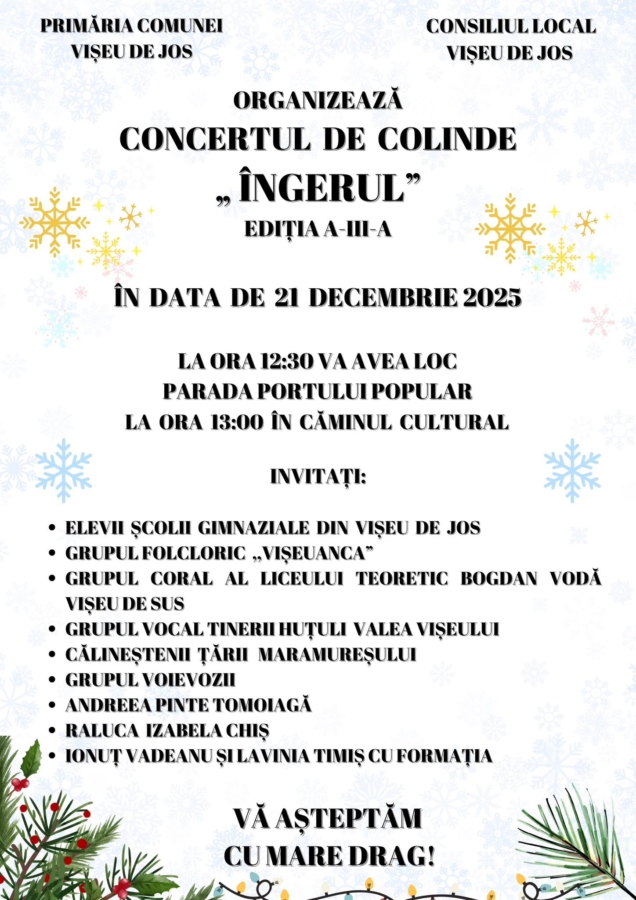 La Vișeu de Jos, tradiția se va împleti cu magia Crăciunului în cadrul Concertului de Colinde „Îngerul”, ediția a III-a, care va avea loc în data de 21 decembrie.