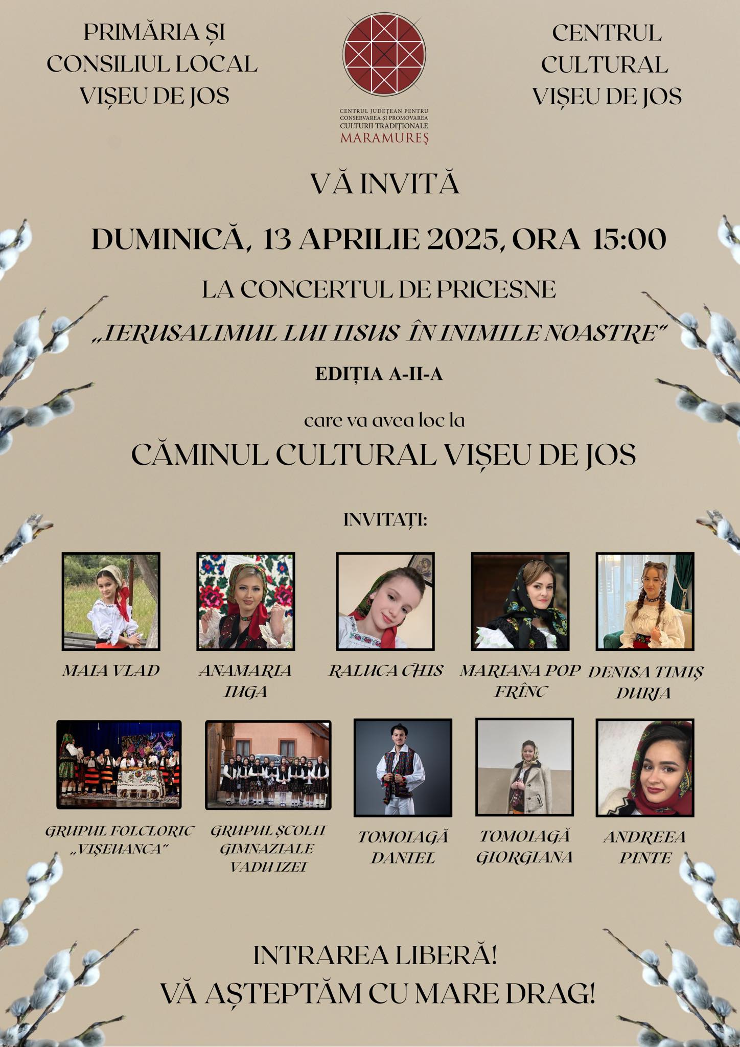 În Duminica Floriilor, 13 aprilie, de la ora 15.00, Căminul Cultural Vișeu de Jos va găzdui Concertul de pricesne „Ierusalimul lui Iisus în inimile noastre” – ediția a II-a.