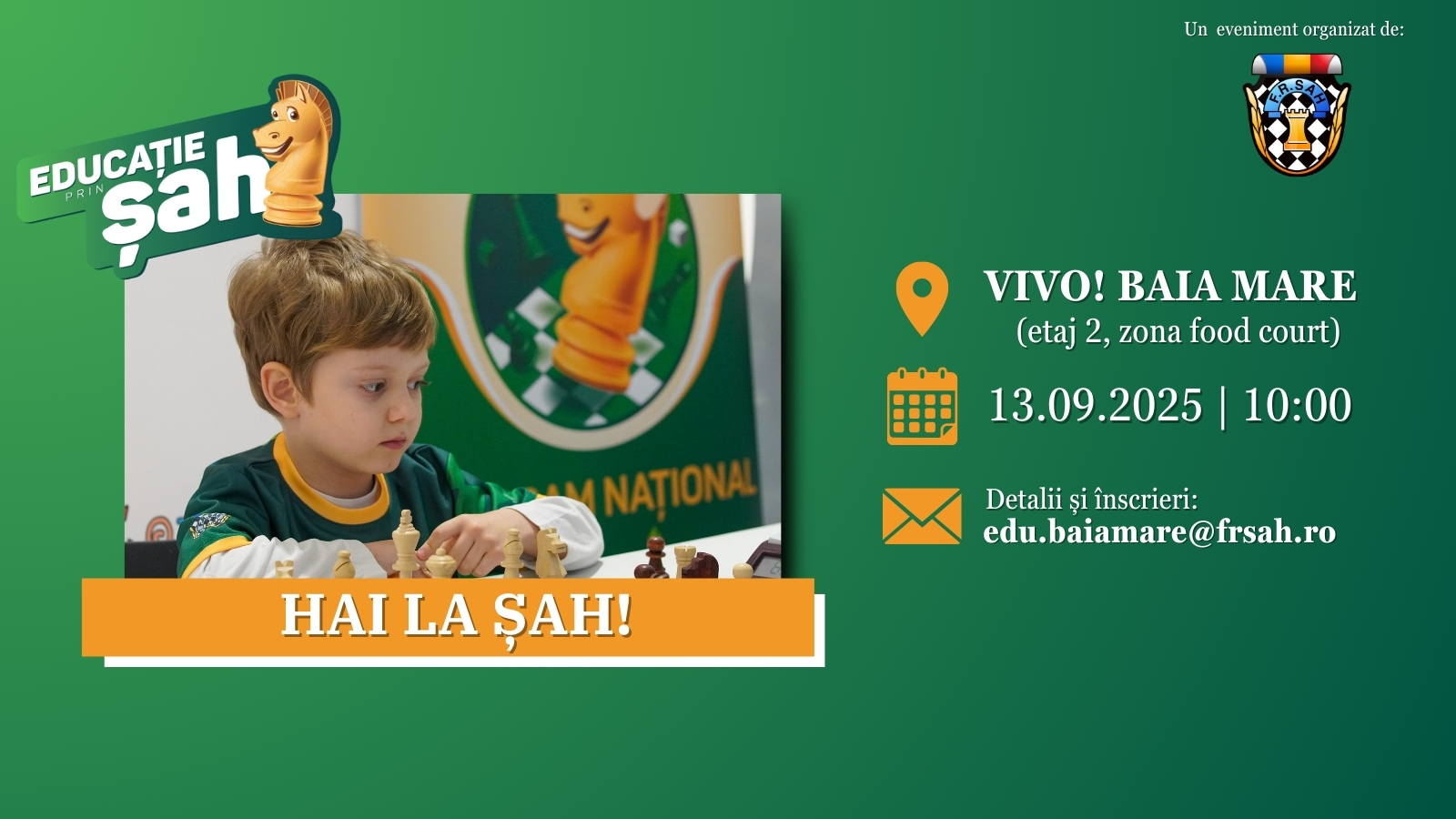 Concursul va cuprinde șase runde, 10 minute/jucător. Locurile sunt limitate. Detalii și înscrieri: edu.baiamare@frsah.ro.