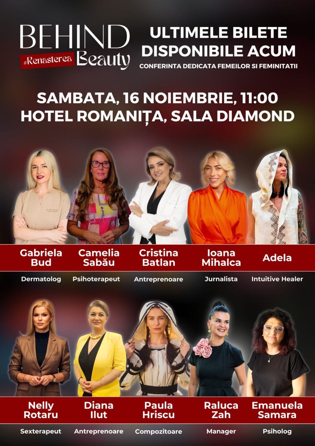 Doamnele și domnișoarele sunt invitate într-o călătorie de regăsire a sinelui, de explorare a nevoilor și a idealurilor, în cadrul conferinței dedicate feminității „Behind Beauty: Renașterea”. Evenimentul va avea loc sâmbătă, 16 noiembrie de la ora 13:00 la Hotel Romanița, Sala Diamond, Baia Mare.