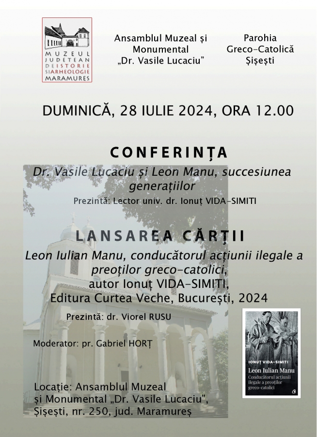 Va urma lansarea cărții „Leon Iulian Manu, conducătorul acțiunii ilegale a preoților greco-catolici”, autor Ionuț Vida-Simiti, Editura Curtea Veche, București, 2024, prezentată de dr. Viorel Rusu, managerul Muzeului Județean de Istorie și Arheologie Maramureș.