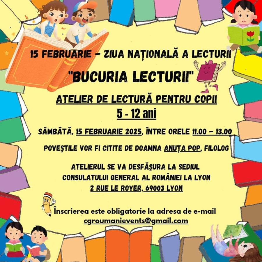 Sâmbătă, 15 februarie, Ziua Naţională a Lecturii va fi marcată printr-un atelier de lectură pentru copii, organizat de Consulatul General al României la Lyon, în parteneriat cu Erol Asso şi Fundația Vasile Tomoiagă din Vișeu de Sus.