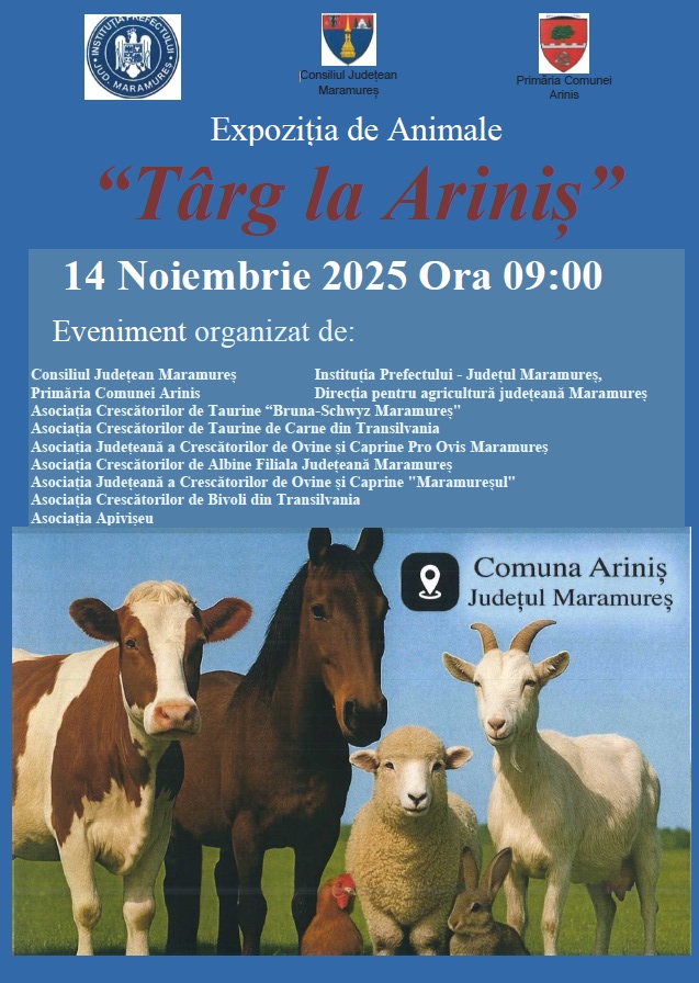 În data de 14 noiembrie de la ora 09:00, în comuna Ariniș, județul Maramureș, va avea loc expoziția de animale „Târg la Ariniș”, eveniment organizat de Primăria Comunei Ariniș, alături de asociațiile partenere, cu sprijinul Consiliului Județean Maramureș.