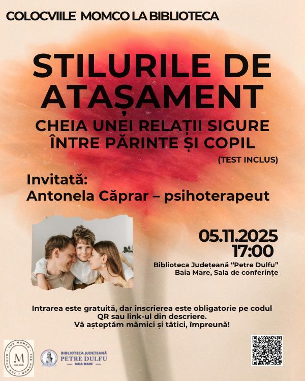 Miercuri, 5 noiembrie de la ora 17:00, la Biblioteca Județeană „Petre Dulfu” Baia Mare va avea loc evenimentul „Colocviile MomCo”, pe tema „Stilurile de atașament – cheia unei relații sigure între părinte și copil”, în cadrul căruia va onora cu prezența psihoterapeuta Antonela Căprar.
