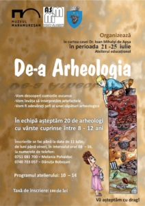Muzeul Maramureșan din Sighetu Marmației organizează în perioada 21-25 iulie atelierul educațional ”De-a Arheologia”. Acesta va avea loc în curtea Casei memoriale ”Dr. Ioan Mihalyi de Apșa” și se adresează copiilor cu vârste cuprinse între 8 și 12 ani. În ultima zi a atelierului sunt invitați să participe și cei mari.