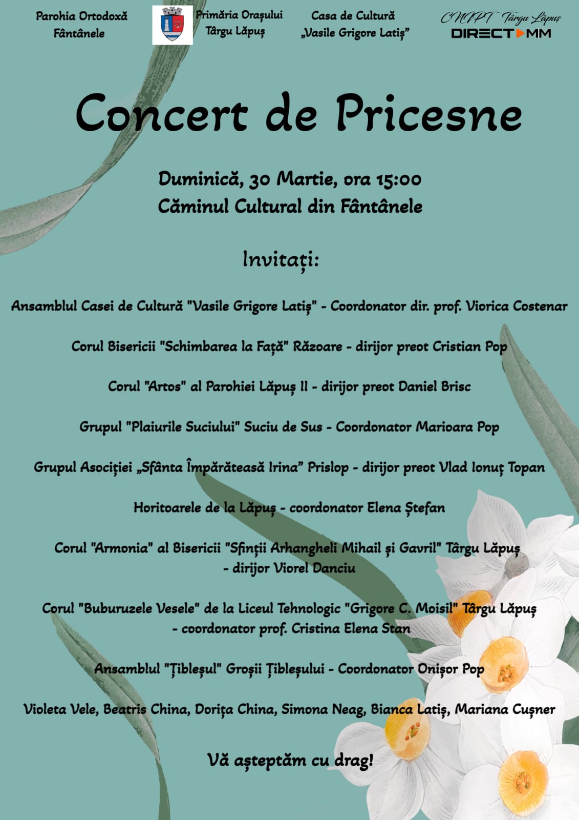 Acest concert este organizat de Primăria Orașului Târgu Lăpuș și Casa de Cultură „Vasile Grigore Latiș”, cu sprijinul Parohiei Ortodoxe Fântânele, Direct MM și a Centrului de Informare Turistică din Târgu Lăpuș.